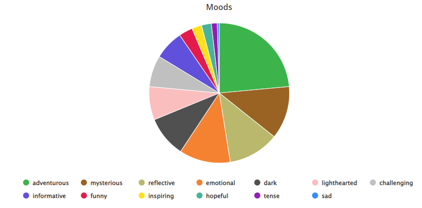 NOTE: I started using The StoryGraph this year instead of GoodReads and consider this an unofficial plug to try this site out. It gives you great end of the year stats (see below for my Moods* and Fiction/NonFiction**)